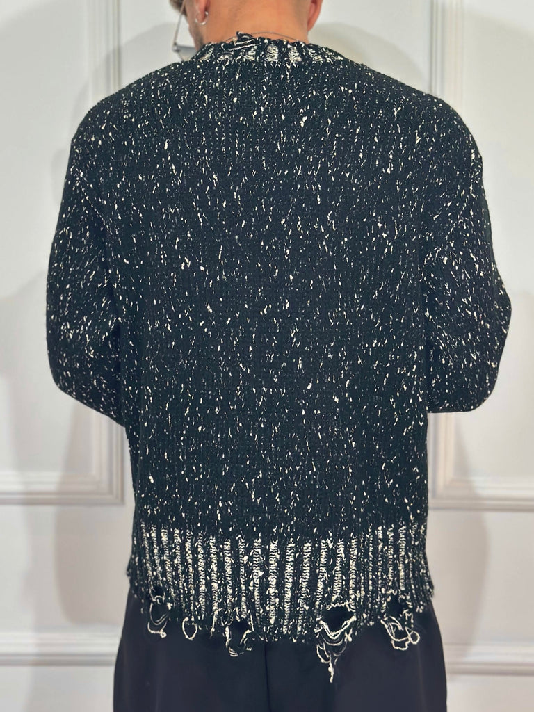 Maglione girocollo color ghiaccio con rotture ai bordi adatto per chi ama differenziarsi; consigliamo l' abbinamento con un jeans o un pantalone con una vestibilità morbida per un look casual street