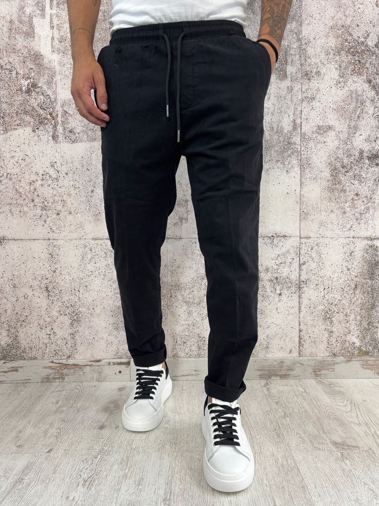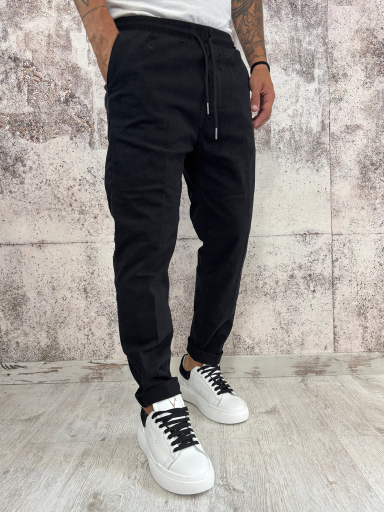 • Pantalone con elastico in vita e gamba morbida che tende a stringersi verso il fondo