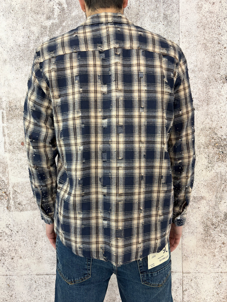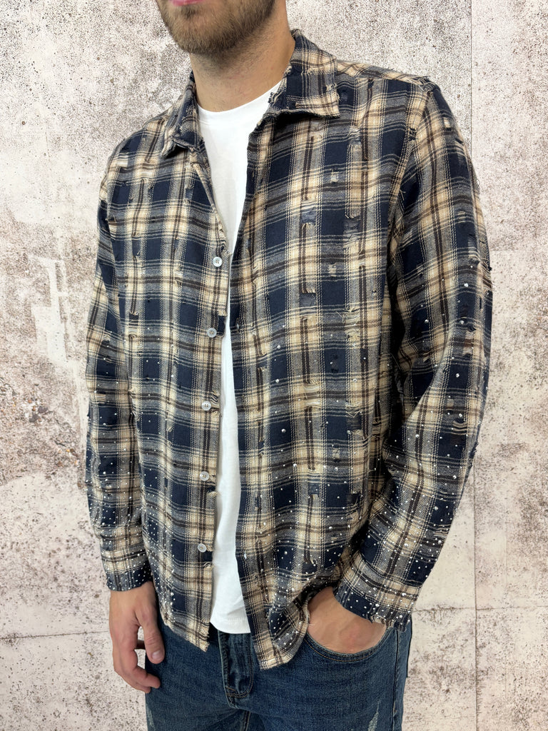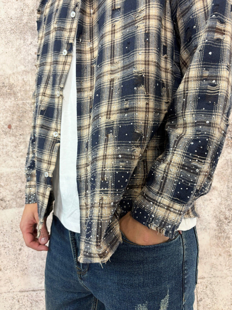 Camicia scozzese sui toni del blu e del beige con piccole rotture e la particolarità dell' applicazione di brillantini nella parte bassa. Perfetta per chi desidera un capo originale e stravagante.