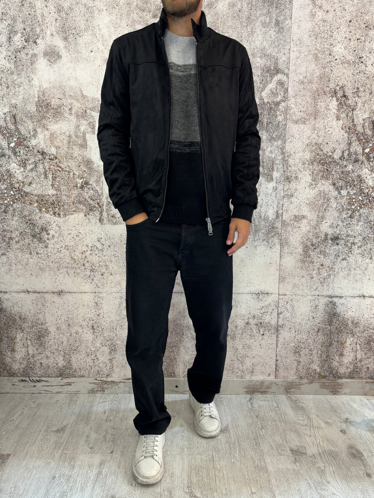 Giubbino scamosciato modello College di Gianni Lupo perfetto per l'inizio della stagione autunnale; foderato internamente, chiusura con zip e bottoni , due tasche con zip esterne e una interna