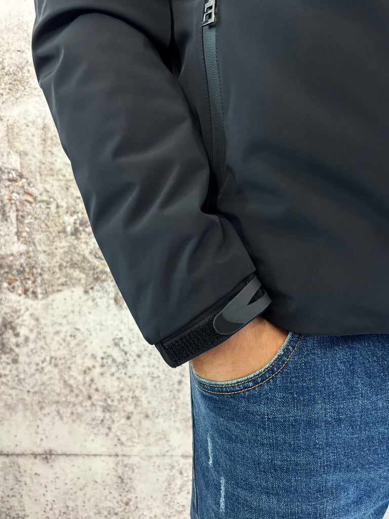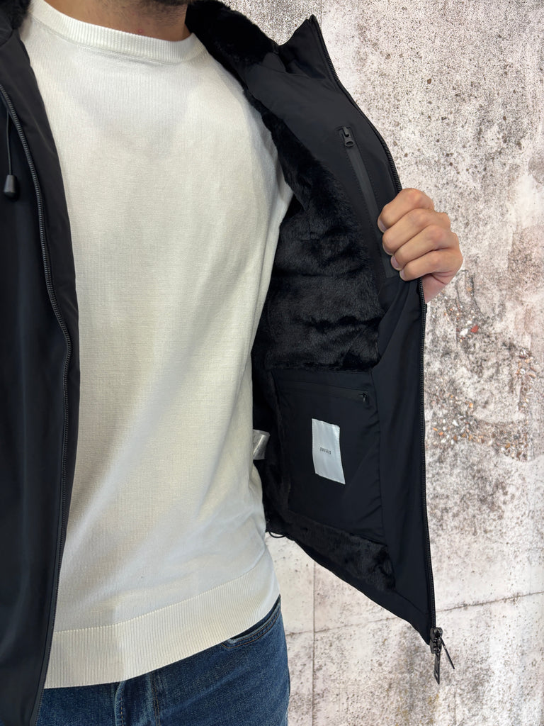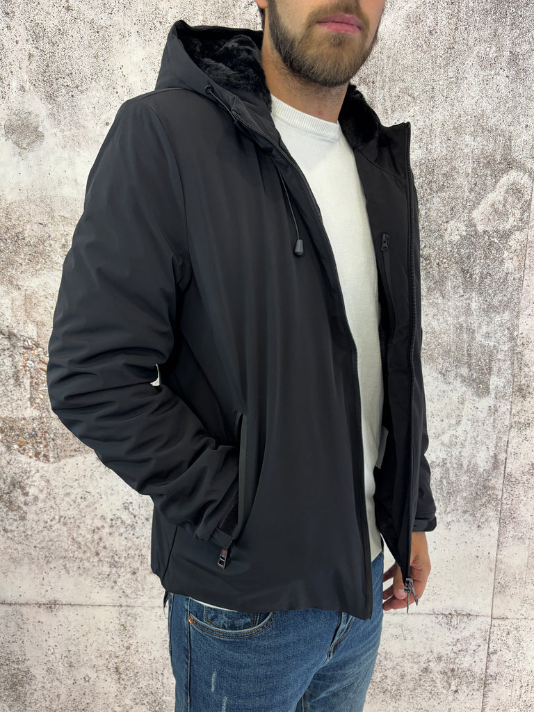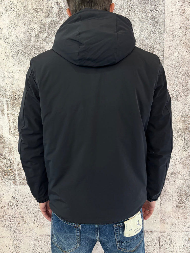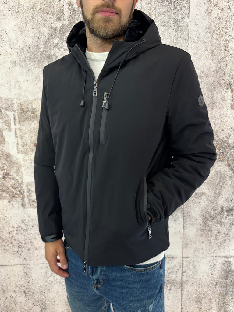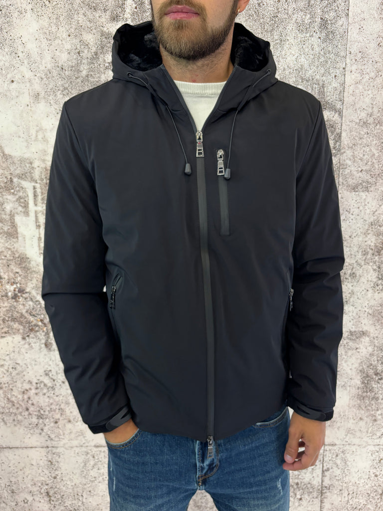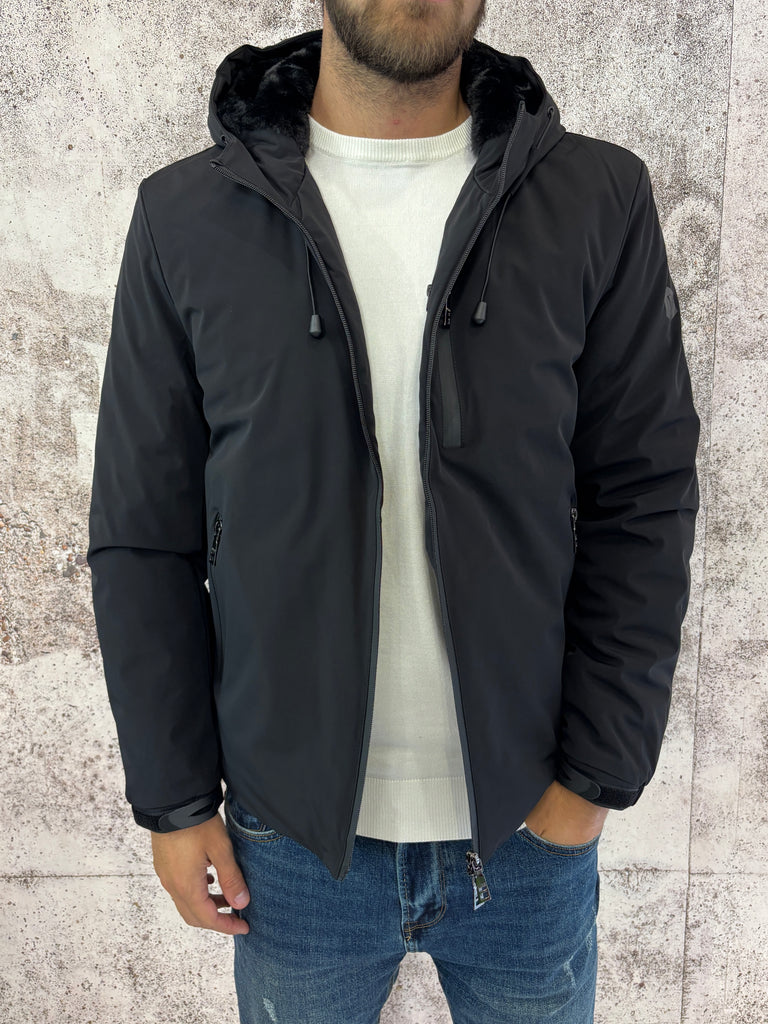 Giubbotto con cappuccio in tessuto tecnico antipioggia e antivento; chiusura con zip termosaldata , due tasche laterali esterne e due interne. Perfetto per la stagione Invernale