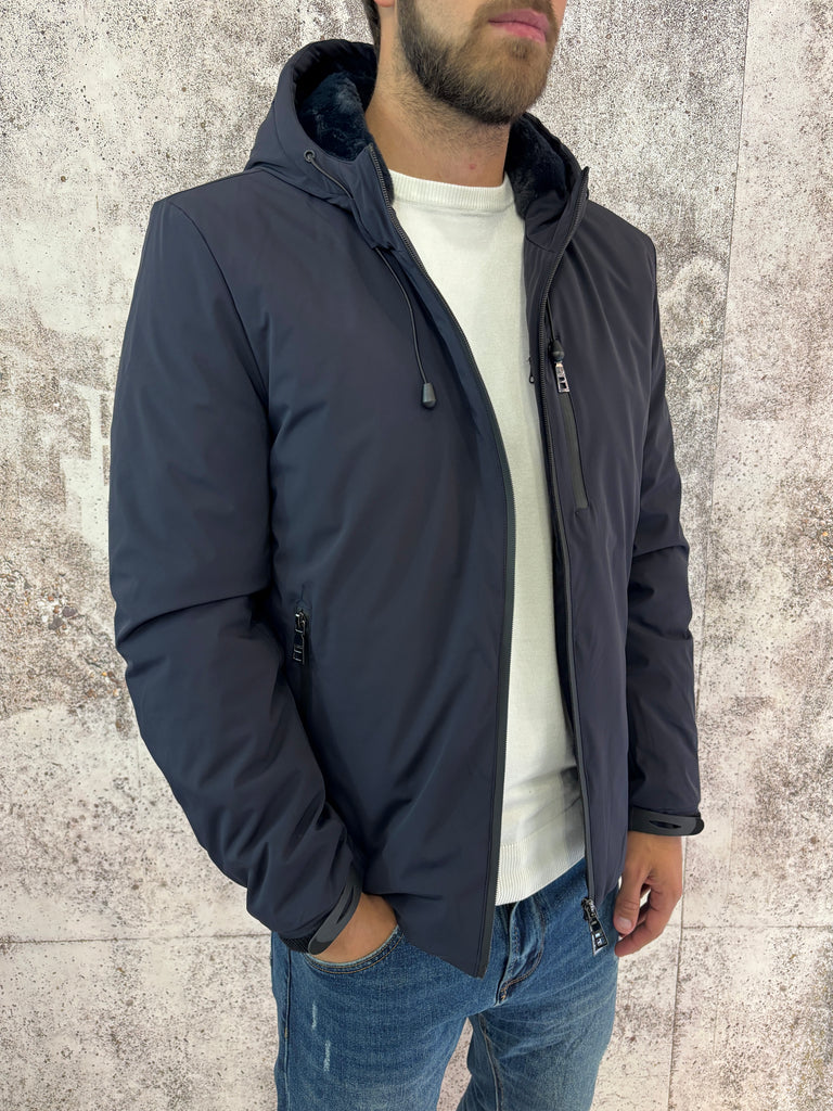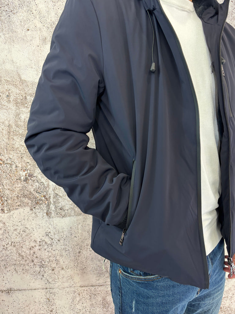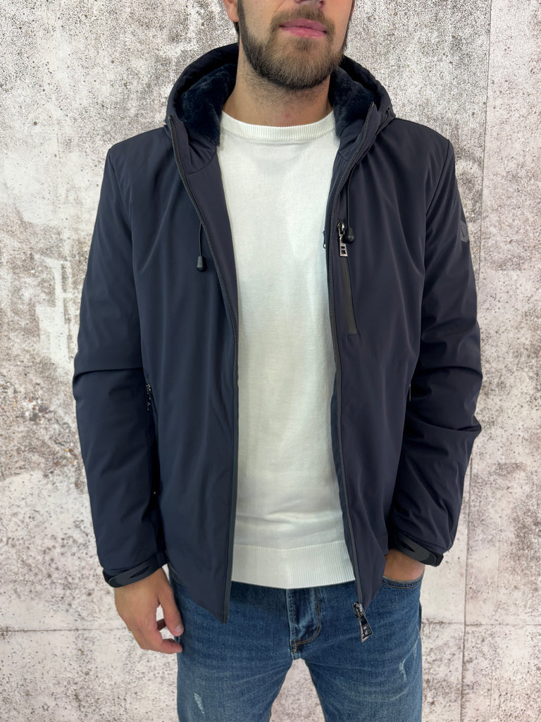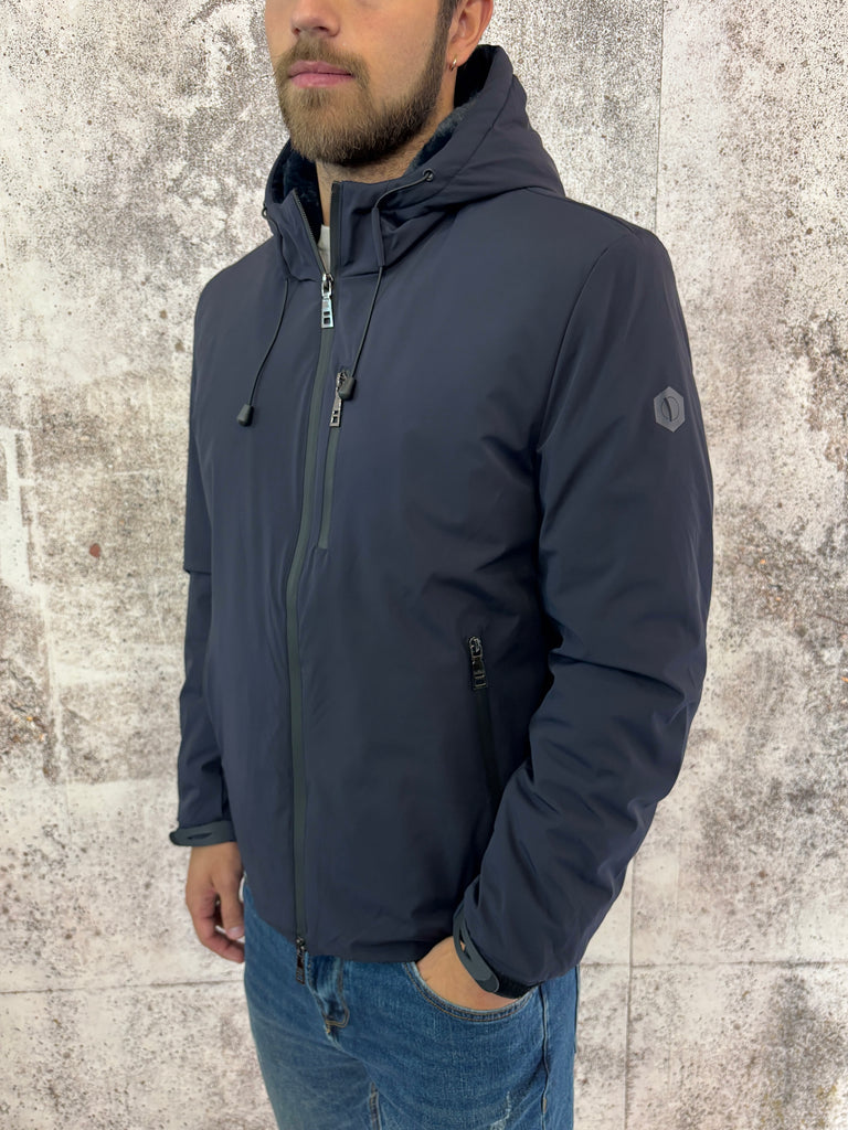 Giubbotto con cappuccio in tessuto tecnico antipioggia e antivento; chiusura con zip termosaldata , due tasche laterali esterne e due interne. Perfetto per la stagione Invernale