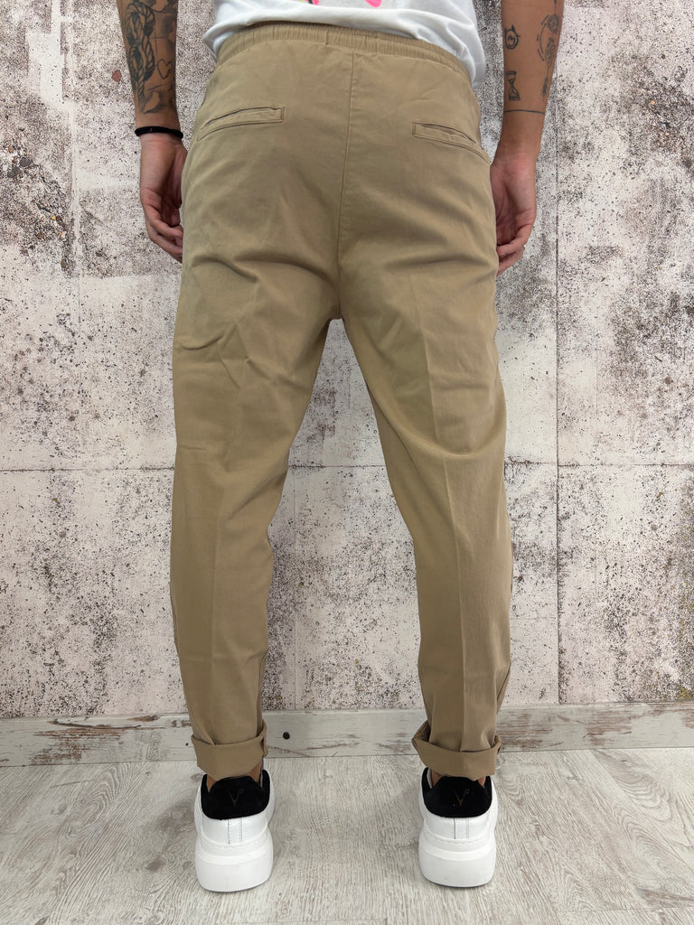 - Pantalone con elastico in vita e gamba morbida che tende a stringersi verso il fondo